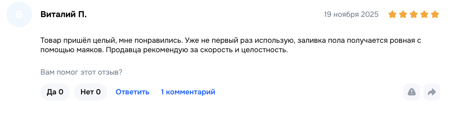 Почитайте отзывы конечных клиентов о маяках для наливного пола Пласт-Плюс